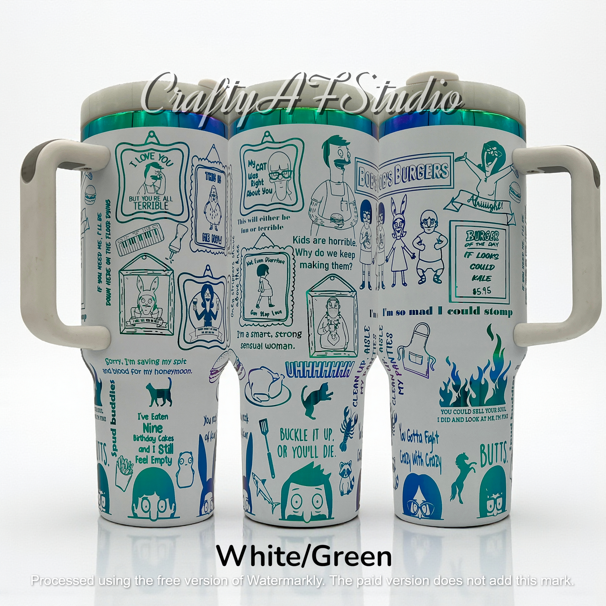 Get ready to flip some patties and serve up fun with our Bob's Burgers themed 40oz tumbler! With laser-engraved designs of your favorite burger-flipping family, this tumbler is perfect for keeping your drinks as cool as Tina's dance moves or as hot as Linda's musical numbers. Whether you're sipping a morning brew or enjoying a refreshing iced tea, this tumbler guarantees a deliciously quirky experience. So, grab your apron, channel your inner Bob, and enjoy your beverage in style. Let's make every sip a pun-tastic adventure!