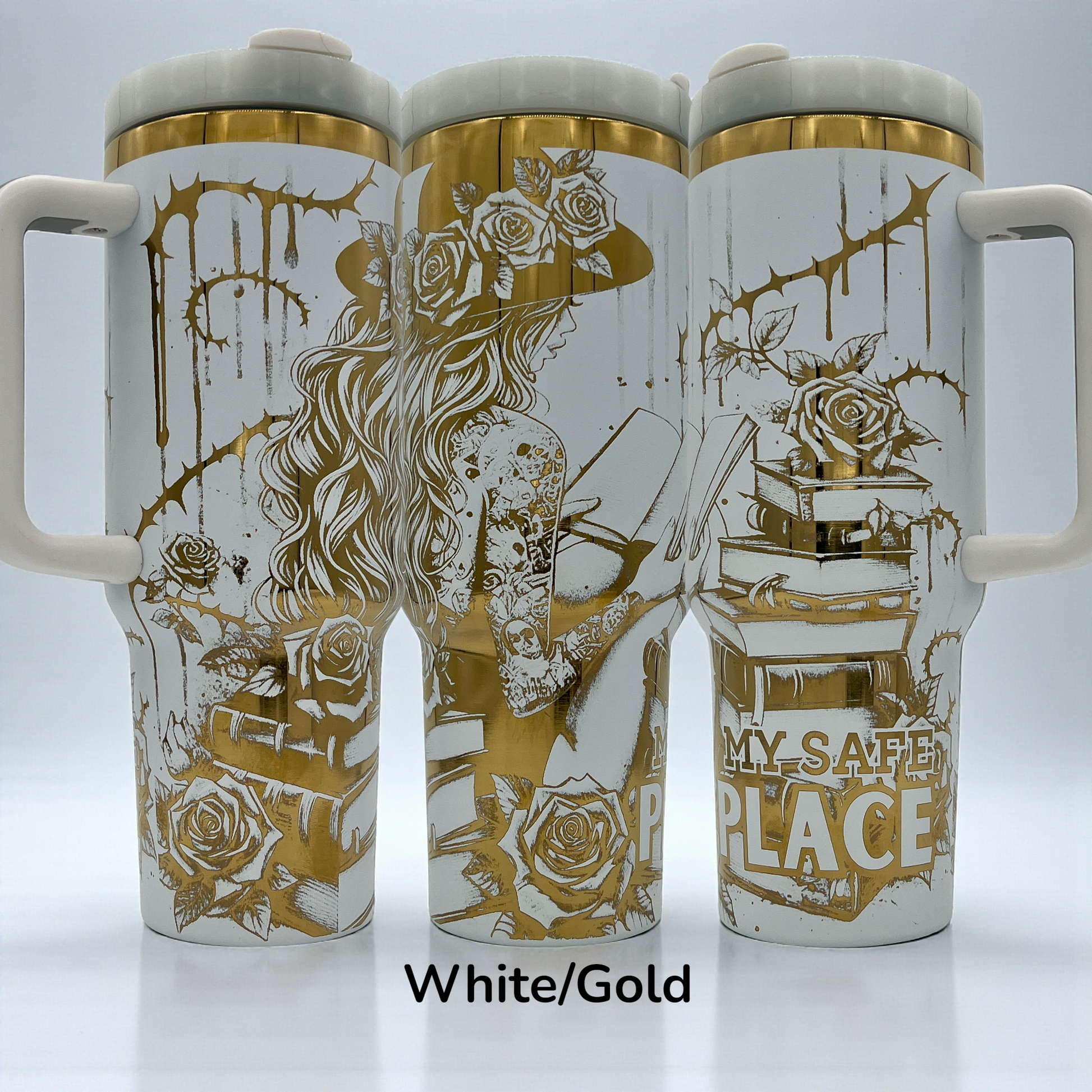 Discover the harmony between literary elegance and practical magic with the "My Safe Place" Tumbler. It’s not just a drinking vessel, it’s your portal to a world where every story is alive, every rose has a tale, and every sip is the beginning of another chapter.
