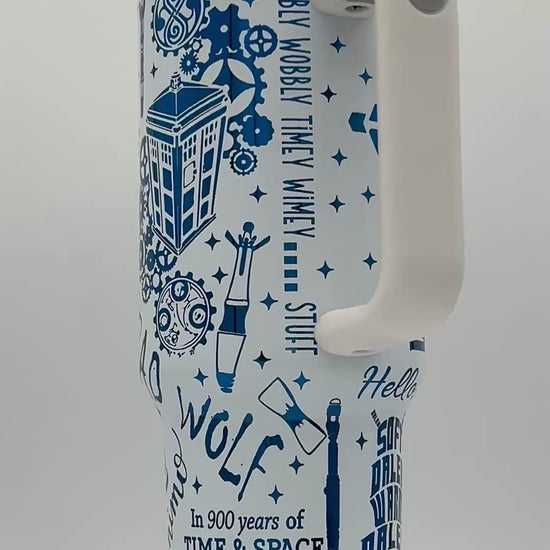 Whether you're sipping coffee while pondering time travel paradoxes, or hydrating during your next marathon of Doctor Who episodes, this design promises to be your trusty companion across space and time. The iconic blue police box, with its timeless allure, is ready to adorn your favorite drinkware, making every sip an adventure through the cosmos.