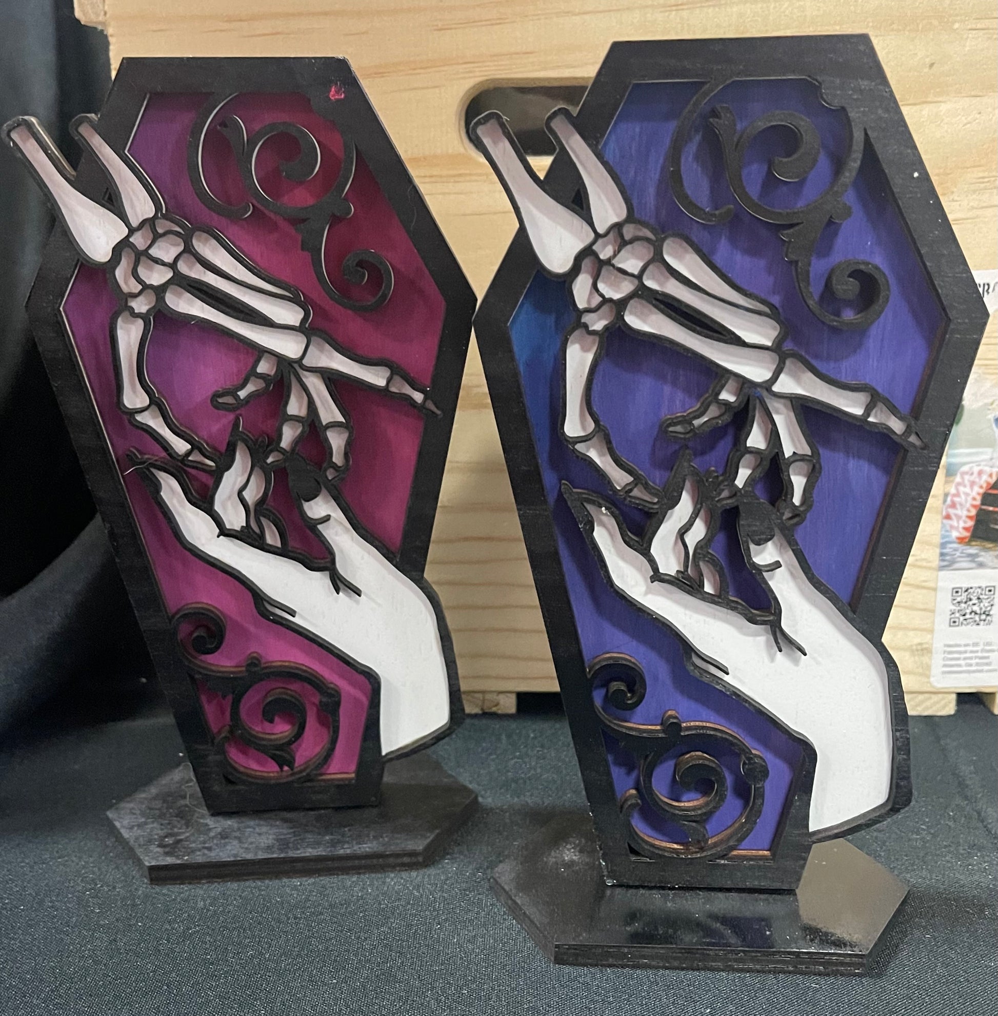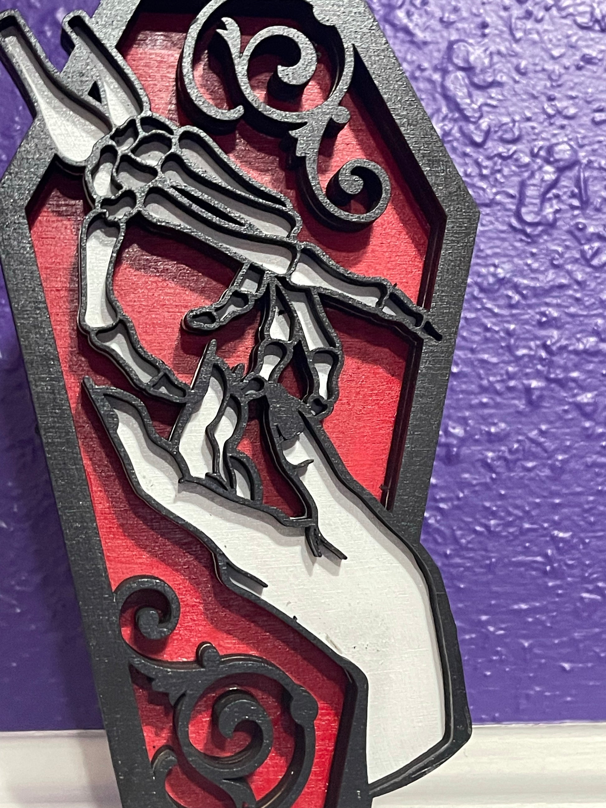 Measures about 8 inches tall, made from layers of 1/4 inch birch wood. Hand painted and sealed.