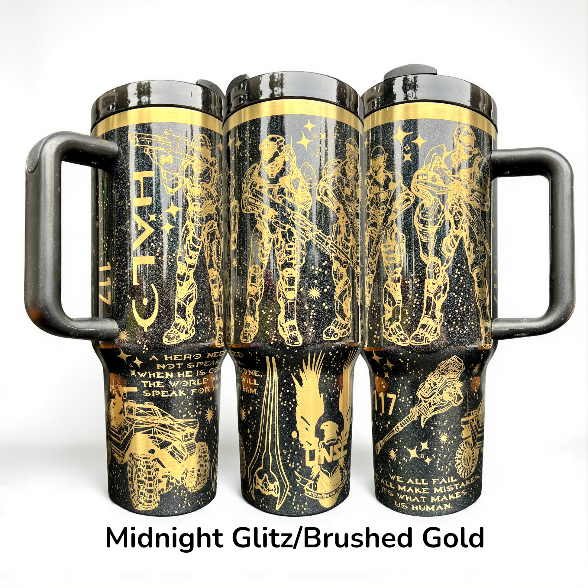 Gear up, Spartans! Dive into your next gaming marathon with the ultimate ally by your side—our Master Chief-inspired Tumbler! This robust 40oz hero is not just any beverage holder, it's laser-engraved with the legendary icon of gaming, ready to accompany you on any intergalactic adventure.