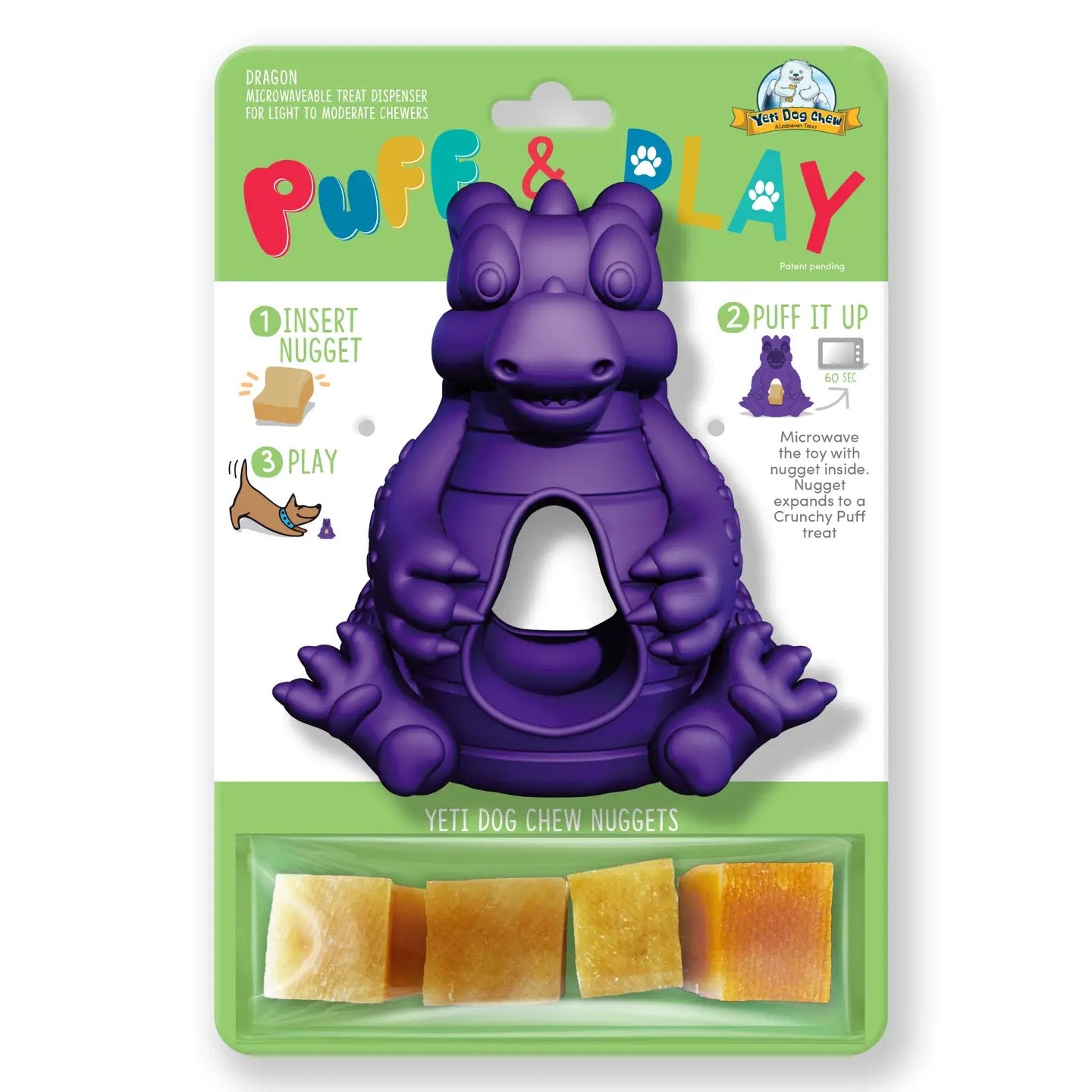 Yak Puff and Play Toy is a long lasting chew treat dispensing toy for light to heavy-moderate chewers. It comes in four different colors: Purple, Green, Red, and Blue. It is microwave and dishwasher safe and works well with all natural Yeti Nuggets.