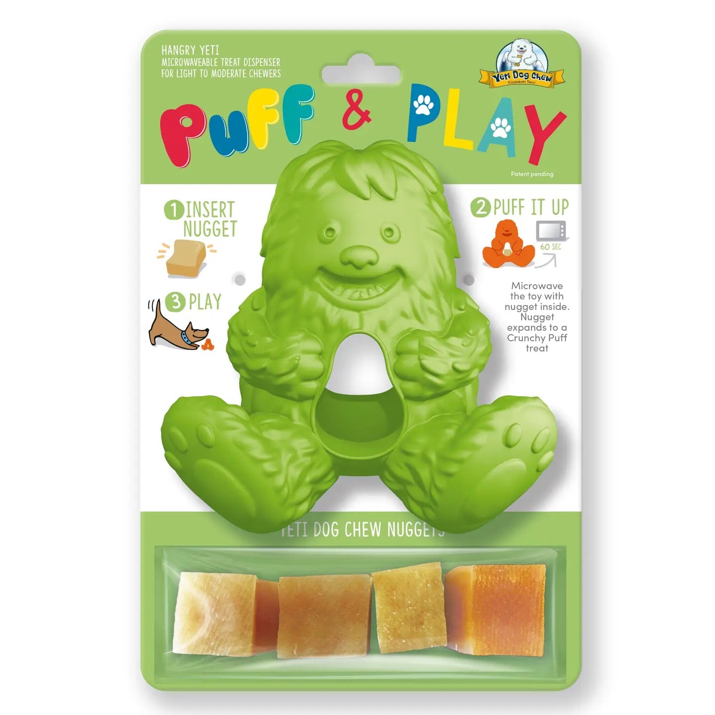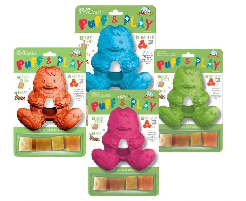 Yeti Puff and Play Toy is a long lasting chew treat dispensing toy for light to heavy-moderate chewers. It comes in four different colors: Purple, Green, Red, and Blue. It is microwave and dishwasher safe and works well with all natural Yeti Nuggets.