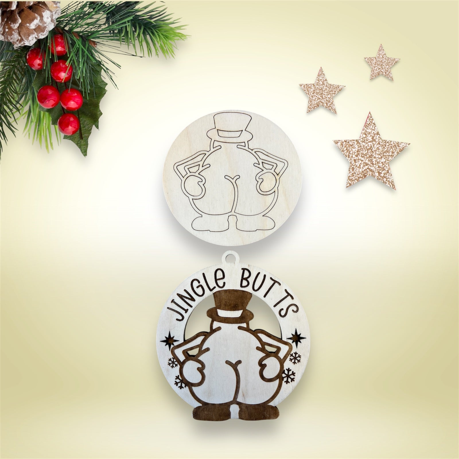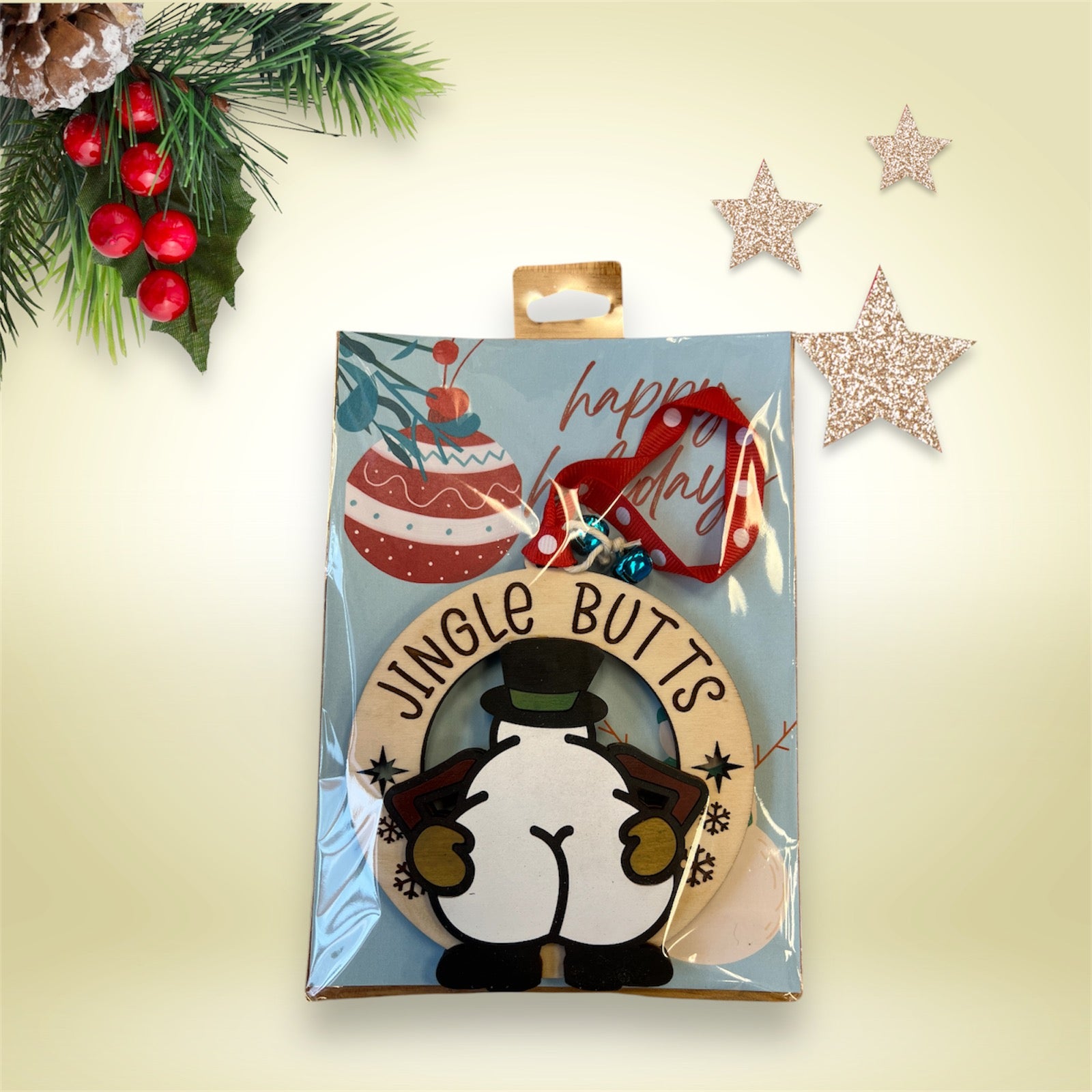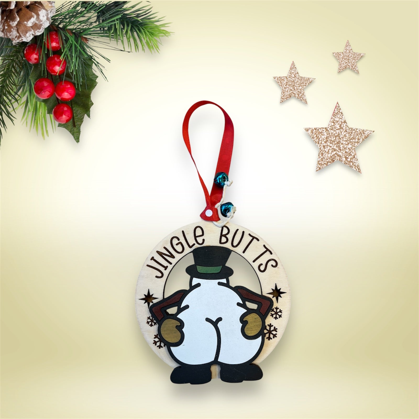 Whether you're decking your own halls or gifting a giggle to a friend, the Jingle Butts - Snowman Ornament promises to be the life of the pine! Add a touch of festive fun to your tree and let every angle of this snowman spread joy and laughter. Don't just jingle, jingle with a giggle!