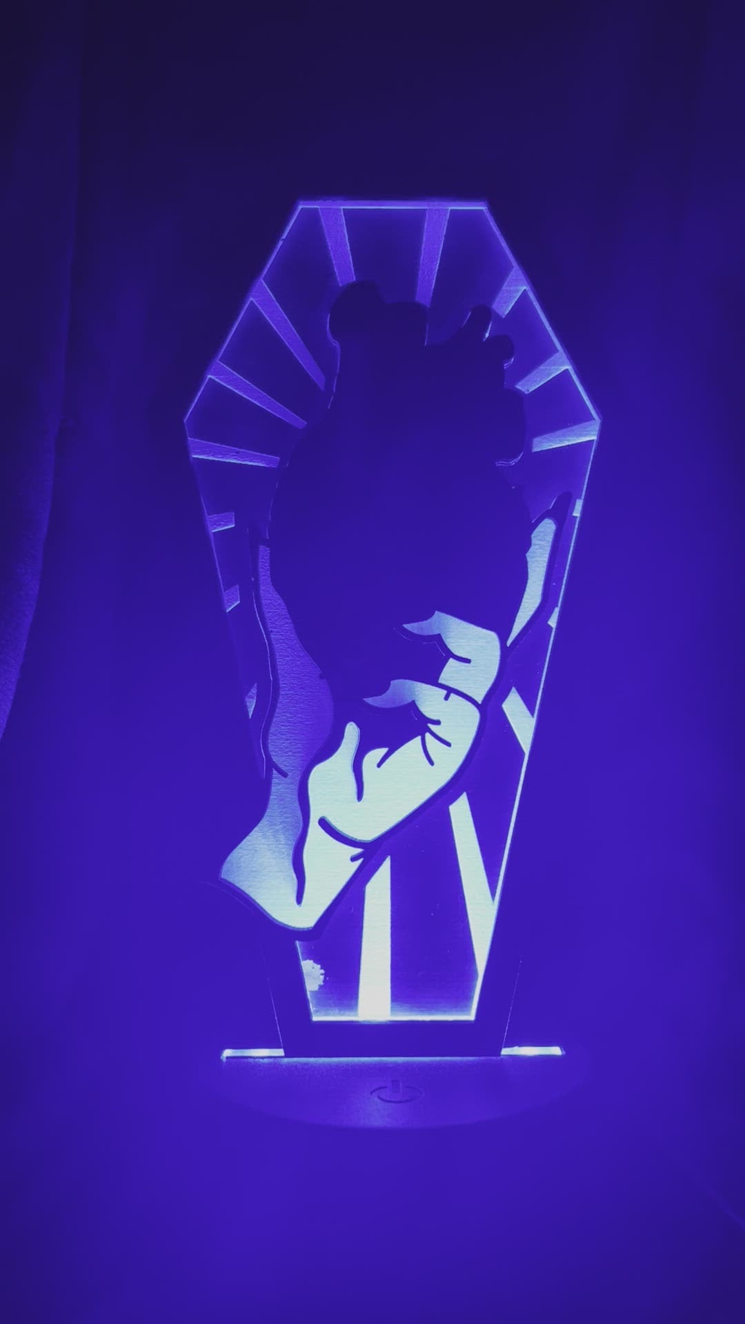 Comes with the lighted base, with the option of using batteries or a USB cord (included) to use. Comes with a remote to change the colors, and patterns.