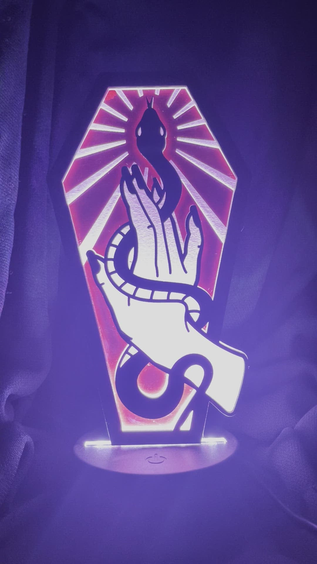 Comes with the lighted base, with the option of using batteries or a USB cord (included) to use. Comes with a remote to change the colors, and patterns.