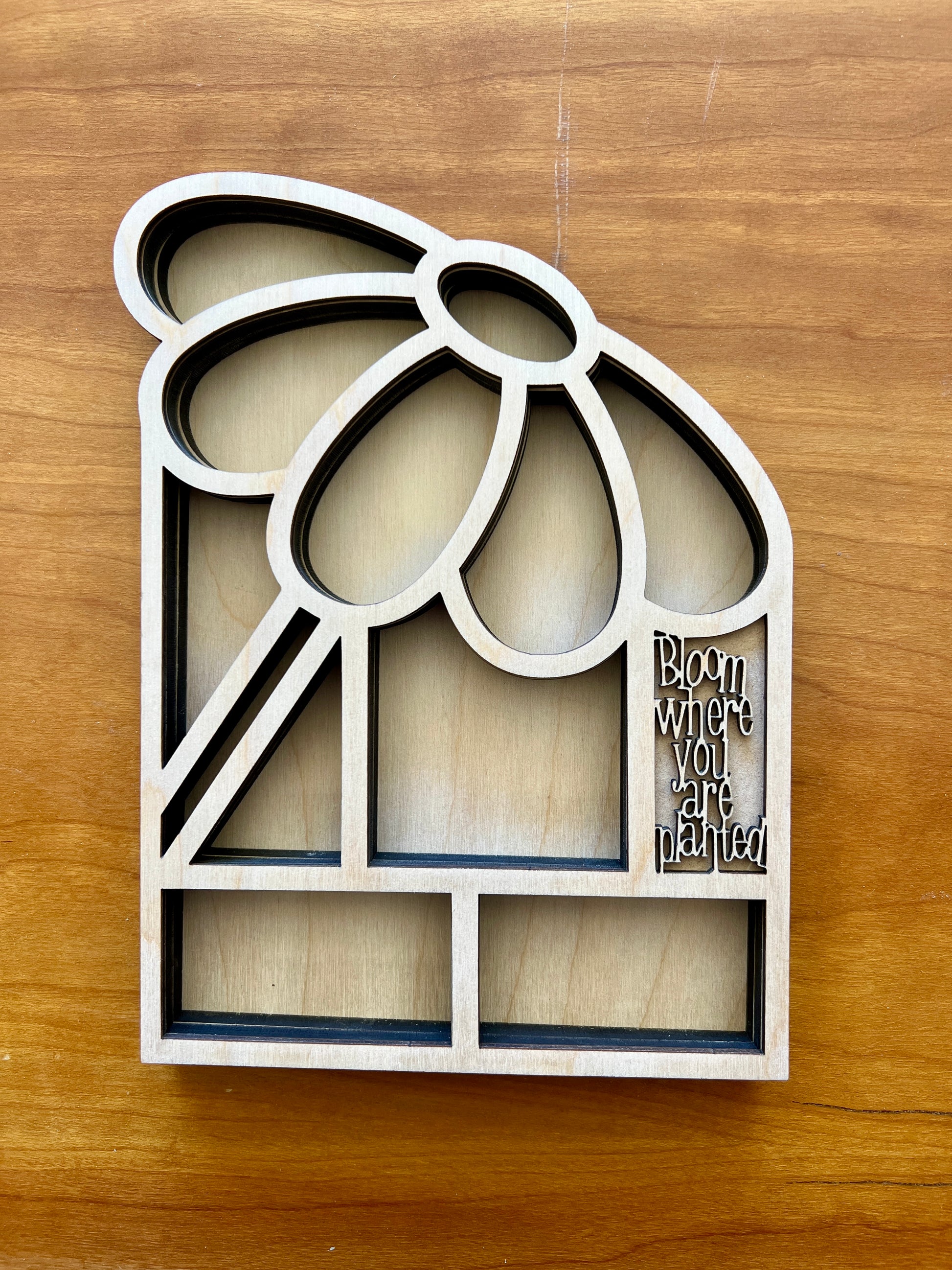 Brighten up your space with this cheerful daisy-inspired DIY mini bookshelf! Precision laser-cut from wood, the layered design features a blooming daisy and the uplifting phrase “Bloom Where You Are Planted,” surrounded by cubby shelves perfect for mini books and tiny treasures.