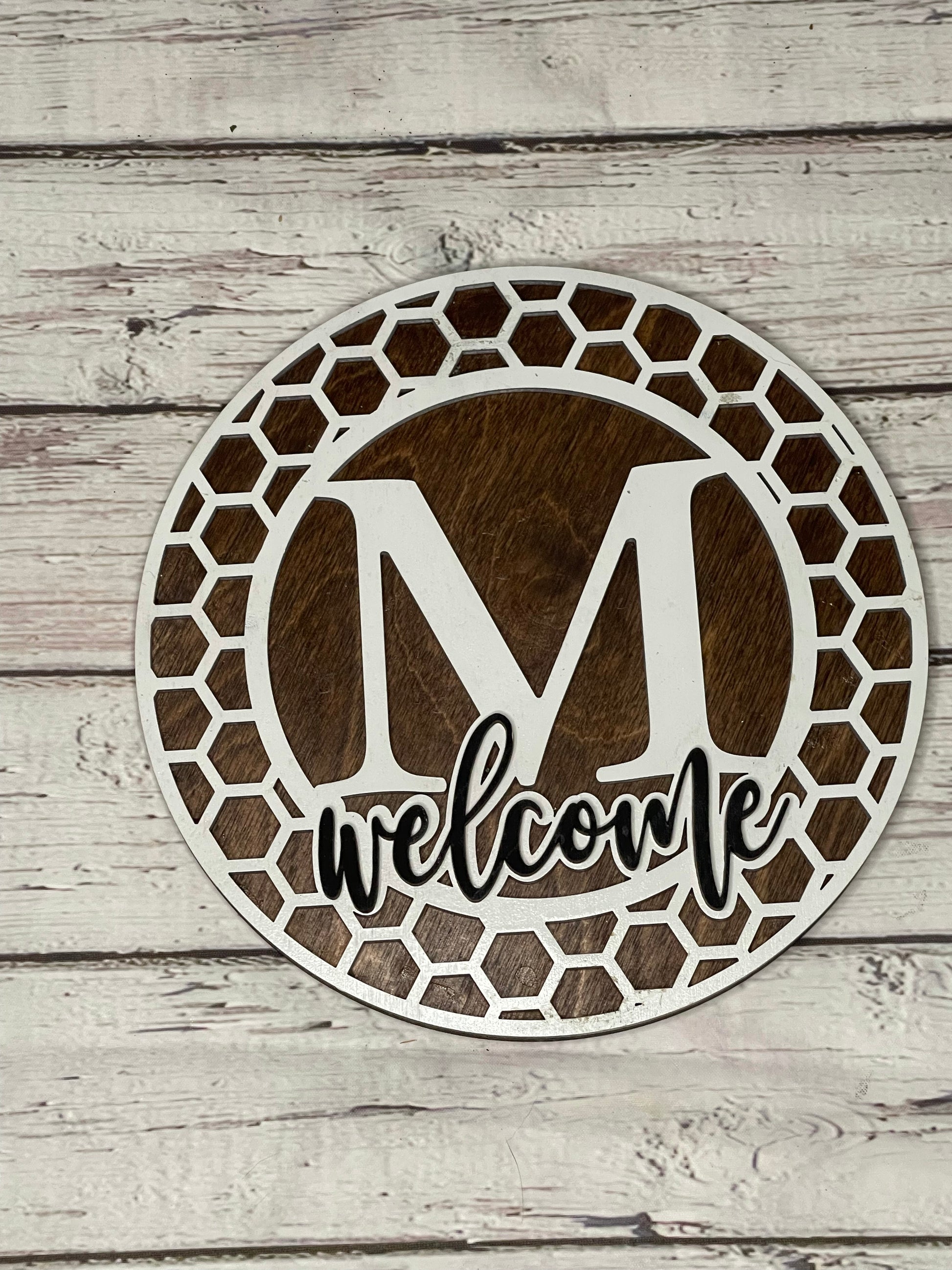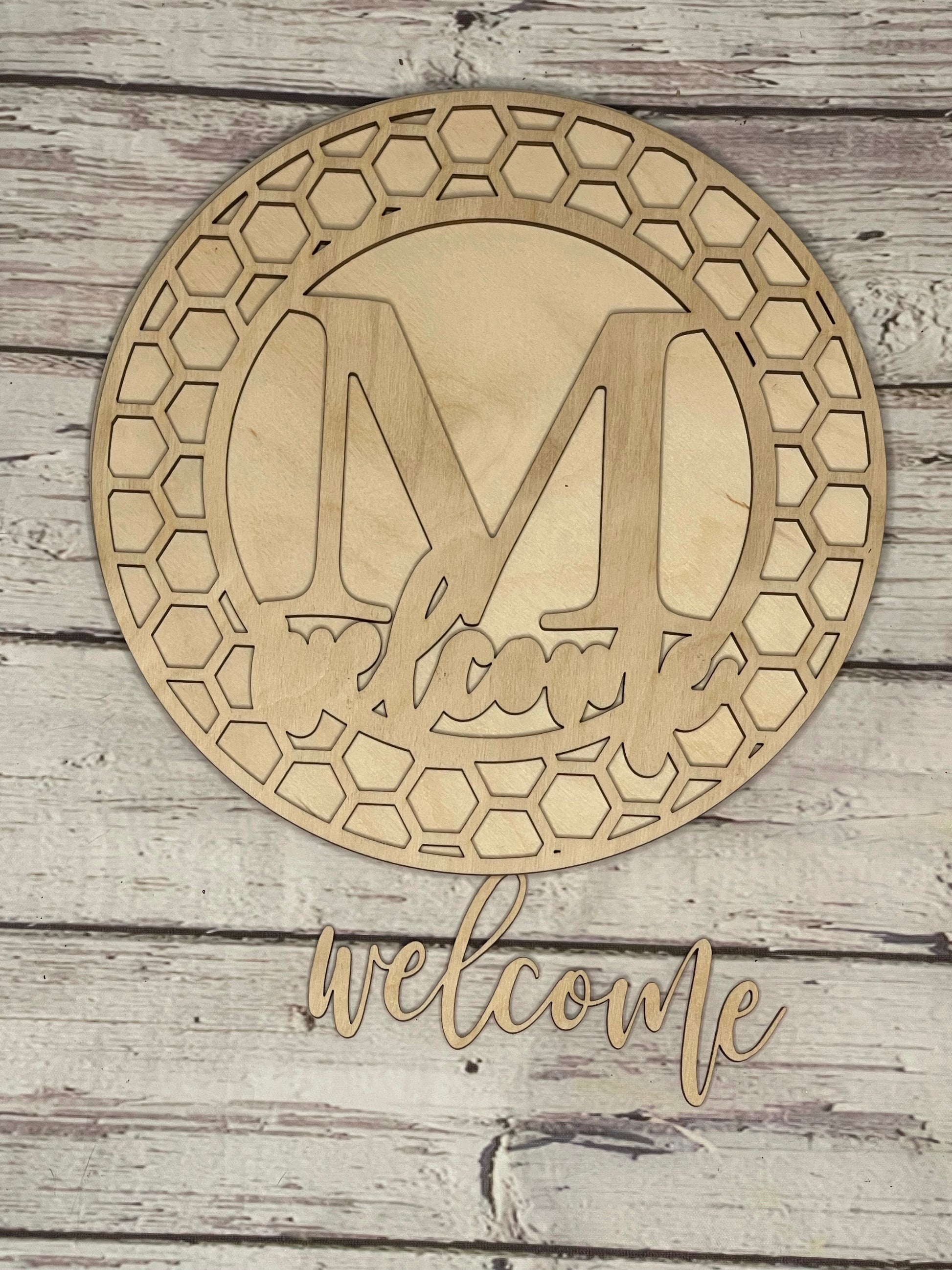 Simple and classic. A honeycomb monogram. Easy to paint and personalize to your own home decor. Choose between multiple sizes. Available in the interchangeable 8 inch sign, up to 20 inch door hanger sign.