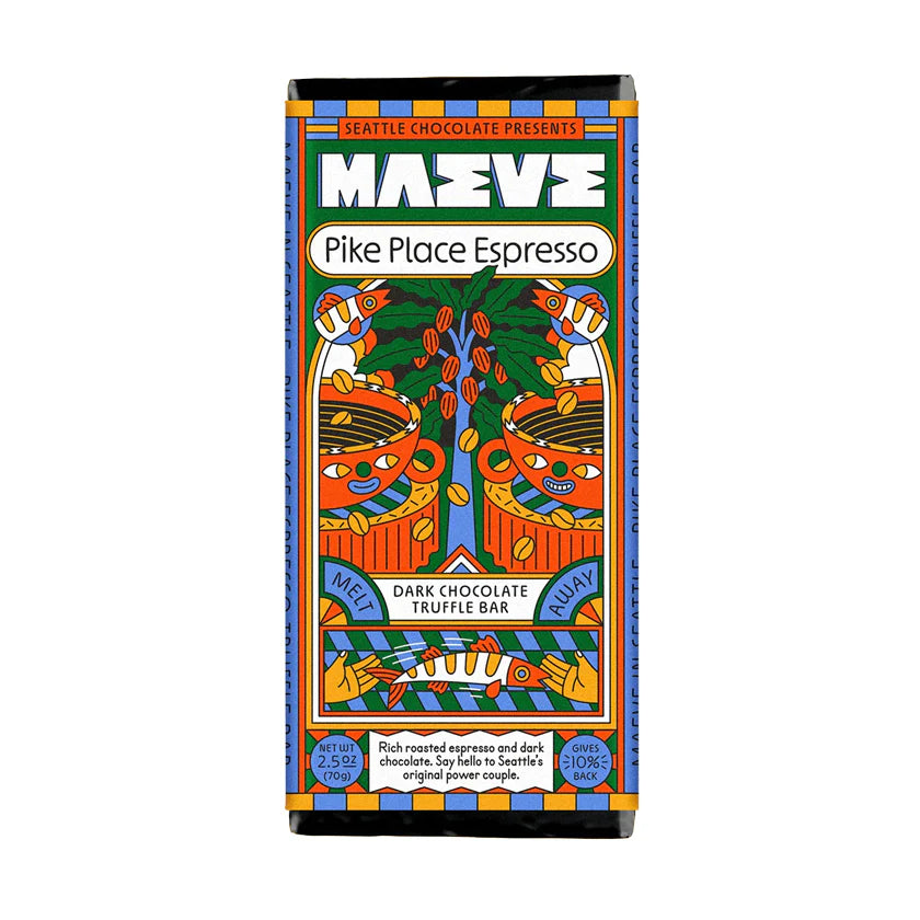 Pike Place Espresso is a Maeve classic - a deliciously deep dark chocolate truffle bar infused with bold decaffeinated espresso, roasted less than 2 miles from the factory.