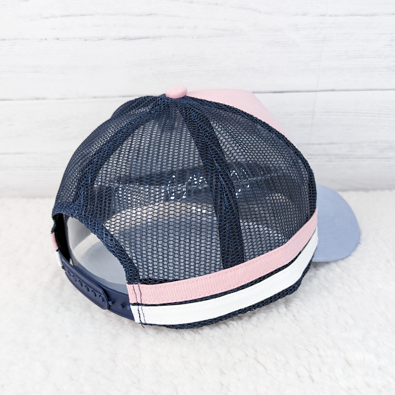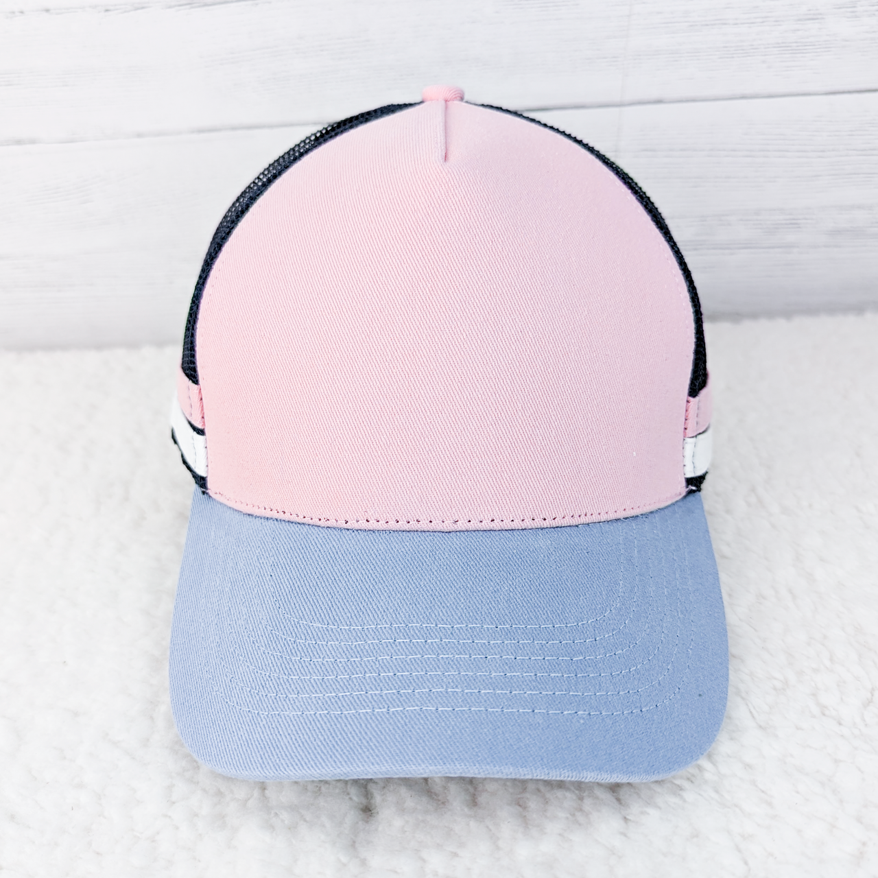 This Pink, Blue & Navy Mesh Trucker Hat delivers a fresh, sporty vibe with a soft pastel twist. The light pink crown pairs perfectly with the powder blue brim, while the navy mesh back and matching navy-and-white side stripes add a bold contrast. Comfortable, breathable, and effortlessly stylish, this hat is ready for everyday wear or personal customization.