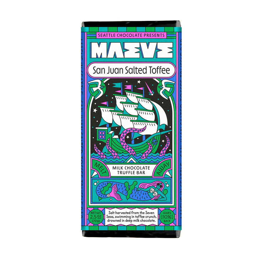 ay ahoy to Maeve’s San Juan Sea Salt truffle bar, made with crunchy toffee and a dash of Pacific sea salt drowned in our dreamiest milk chocolate. Looks like we found Pinkbeard’s new favorite treat. He may have looted our town, but it looks like we stole his heart.