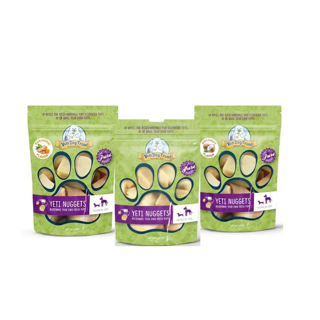 Refill nuggets for the Puff & Play Toy. All-natural hard cheese made from yak milk, cow milk and lime juice. No added salt or preservatives. Traditionally made for human consumption, this smoky hard cheese has become a favorite for dogs. Microwave each nugget for approximately 60 seconds; it will puff up to twice its original size. Let it cool and let your dog enjoy! Virtually no odor and leaves no stain. Imported from Nepal, made in the Himalayan region.